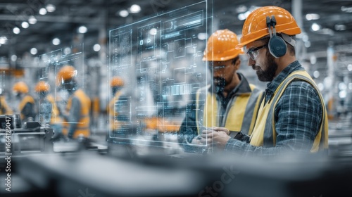 factory, men at work, holographic, datum, transparent, screen, manufacturing, hard, hat, safety, plant, technology, engineering, industry, industrial, production, automation, digital, futuristic, development, research, innovation, modern, system, analysis, blueprint, construction, site, teamwork, collaboration, professional, occupation, design, equipment, technician, maintenance, infrastructure, engineer