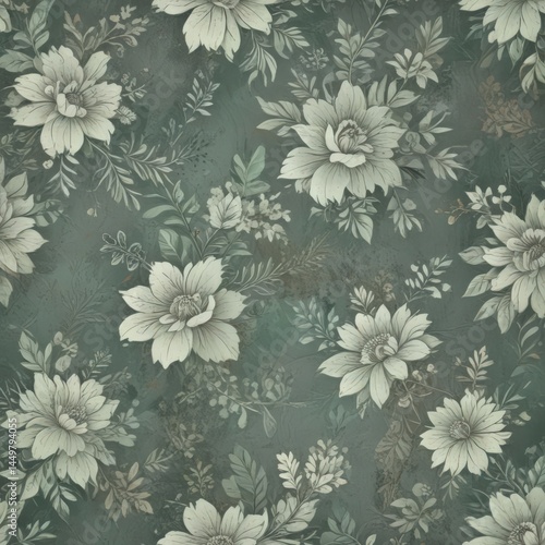 Faded green floral pattern on grunge texture Retro style, muted tones , details, distressed, illustration