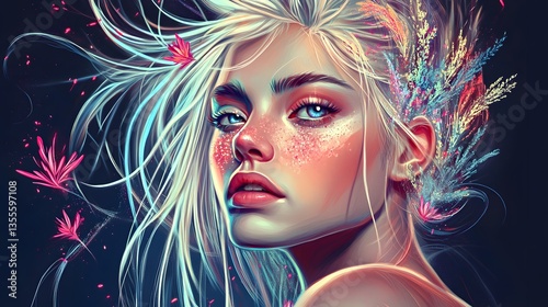 woman, portrait, beauty, silver, hair, flower, floral, pink, glow, skin, face, eye, make-up, light, fantasy, art, illustration, digital, model, female, magical, dreamy, aethereal, delicate, serene, captivating, alluring, graceful, enchanting, elegance, aesthetic, artistic, vibrant, colourful, detailed, realistic, stylised, portraiture, artwork, design, creative, expressive, imaginative, gorgeous, mesmerizing, charming