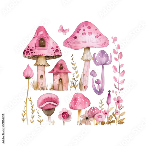 fairy, garden, mushroom, pink, fantasy, flower, watercolor, clip art, magical, enchanted, whimsical, forest, bungalow, cute, delicate, dreamy, aethereal, folklore, hand-painted, illustration, nature, rustic, vintage, botanical, spring, summer, childlike, greeting card, invitation, party, childcare center, decor, printable, digital artwork, artwork, design, creative, artist, hand-made, unique, original, inspired