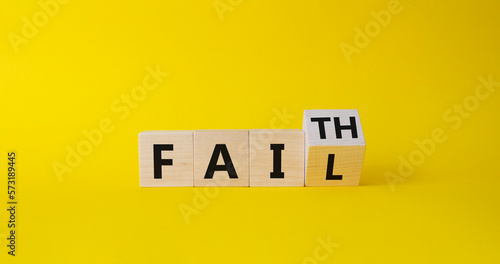 Faith vs Fail symbol. Turned wooden cube with words Fail and Faith. Beautiful yellow background. Business and Faith vs Fail concept. Copy space