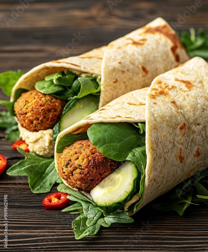 Falafel wraps filled with cucumber slices, fresh leafy greens, hummus, and topped with chili slices. A healthy and flavorful plant-based meal on a wooden surface.