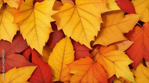 Fall leaves are laying down on a brown background. Generative AI.