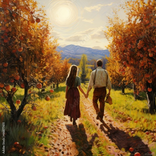Fall romance in apple orchard: couple strolls amongst harvest.