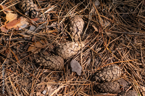 Fallen cones and orange needles on the ground. Sunrays and shadow