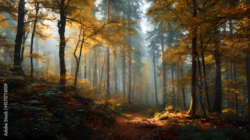 autumn, fall, forest, landscape, golden light, mist, fallen leaves, peaceful, calmness, serene, nature, timberland, seasonal, fall foliage, autumn color, golden hour, tree, natural beauty, quiet, dreamy, morning light, scenic view, fall season, stillness, seasonal change, rustic, calm, aethereal, warm tones
