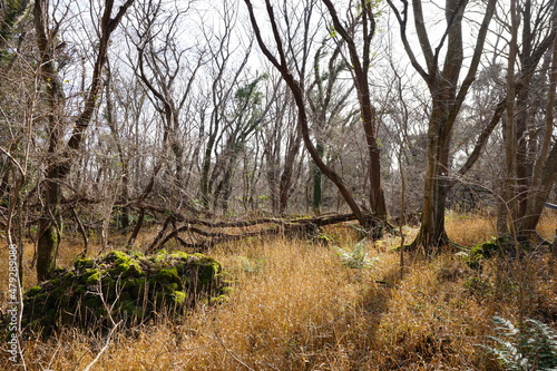 fallen trees and bare trees in the winter forest