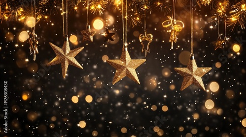 Falling golden stars illuminate the night, with shimmering bokeh lights enhancing the serene and festive atmosphere on a black backdrop.