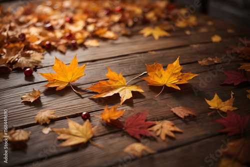 Falling maple leaf's on the empty wooden table top in autumn