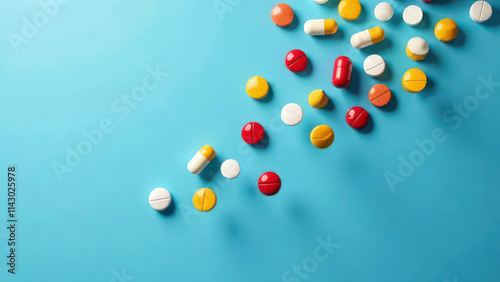 Falling multi-colored pills on a blue background, top view