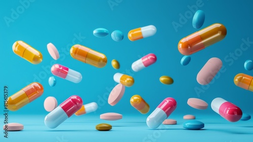 Falling multi-colored pills on a blue background, top view.