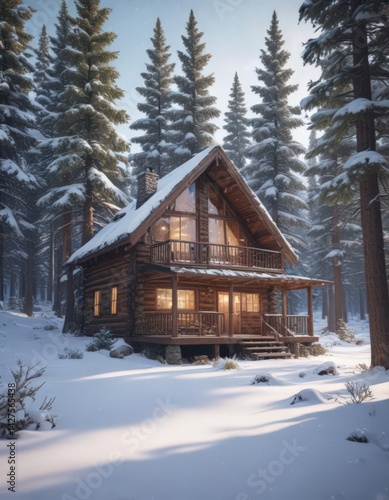 Falling snow blankets cabin nestled amongst snowy pines , cozy, image