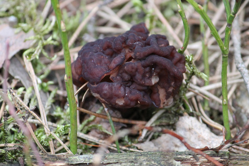False Morel (Gyromitra esculenta) mushroom in forest. April, Belarus