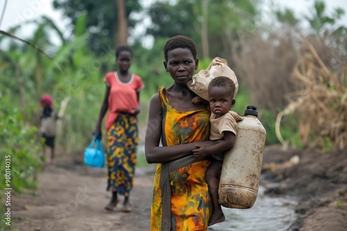 family, africa, water, food, poverty, children, dirt, path, community, resilience, struggle, gathering, daily, life, rural, survival, hardship, adult, nature, landscape, environment, domestic, mother, children, transportation, container, livelihood, essential, support, helping, journey, caring, health, village, tradition, culture, basic, need, agriculture, conservation, resource, empowerment, oneness, love, teamwork, hope, safety, subsistence