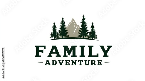 Family Adventure logo featuring mountain and pine trees, perfect for outdoor recreation businesses and travel promotions