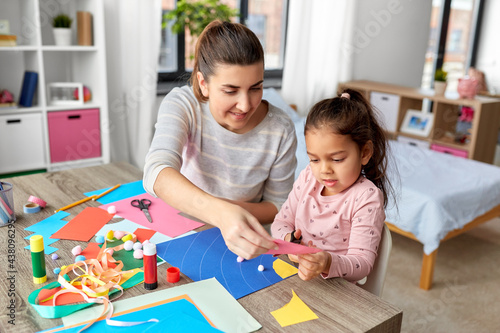 family, art and craft concept - mother spending time with her little daughter with glue making applique of color paper at home