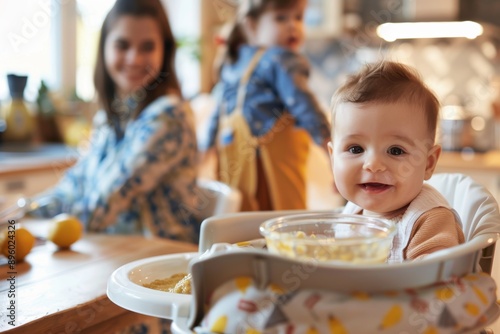 family, kitchen, baby food, bonding, high chair, baby, happy, togetherness, mother, sibling, excitement, curiosity, interaction, parenting, childhood, family time, cooking, ingredient, fresh food, joy, smiling, toddler, table, apron, healthy eating, nurturing, love, comfort, home, activity, organic food, alimentary, glass bowl, family life, playful, domestic, household