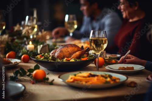 Family celebrates Thanksgiving together. People are sitting at table and eating roast turkey at festive dinner