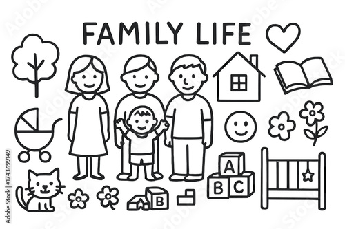 Family Doodles Collection. Family life. Hand-drawn doodle illustration family life parents, child, stroller, house, heart, book, tree, pet, toy blocks, crib,