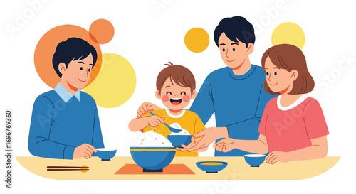 family, happiness, mealtime, gathering, togetherness, children, joy, smiling, sharing, dinner, eating, food, cheerful, lifestyle, illustration, love, happy, bowl, cookery, table, home, children, human relationships, together, people, healthy, fun, cartoon, friendship, portrait, meal, asian, leisure, weekend, support, care, simple, casual attire, life, culture