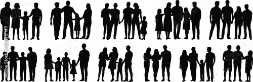 Family group silhouettes, parents and children illustration, happy family vector, people together, bonding, love, unity, social connection, black design flat vector illustration