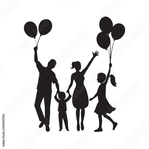 family, holding, balloon, silhouette, vector, celebration, happy, fun, children, eltern, love, graphic, art, illustration, black, icon, party, holiday, together, joy, cartoon, scene, happiness, cheer, festival, cloud, festive, wind, children, balloon, children, smile, sky, design