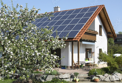 house, photovoltaic, solaranlage, solar, enclosure, new, solar electricity, brick, detached house, roof, solar cell, montage, energy, solar panel, solar energy, stream, environment, artificer, blue, solar energy, renewable energy, ecology, business, technology, heaven, module, rock garden, garden, tree, home, family, home, terrace, flower, grass, money, finance, funding, credit