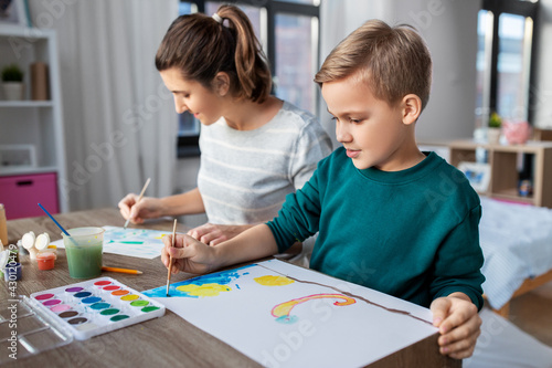 family, leisure and people concept - mother and little son with colors and paper drawing at home