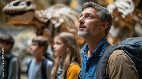 family, museum, dinosaur, skeleton, fossil, exhibit, paleontology, science, education, learning, wonder, amazement, curiosity, discovery, history, prehistoric, extinct, bone, tyrannosaurus, tyrannosaurus, archaeology, biology, natural history, children, children, children, teenage, boy, girl, father, man, woman, adult, group, together, looking up, awe, inspiration, backpacker