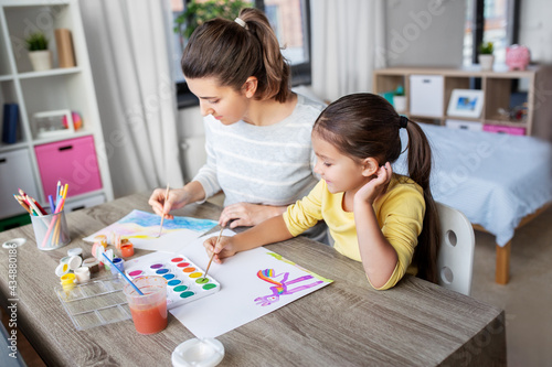 family, motherhood and leisure concept - mother spending time with her little daughter drawing with colors at home