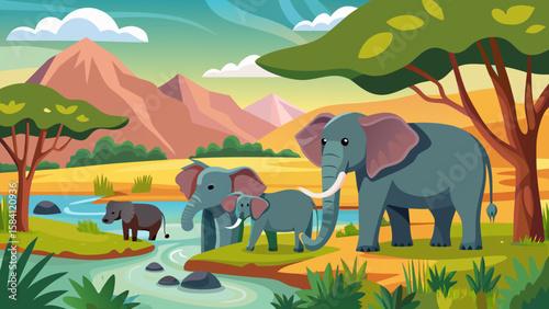 elephant, family, savanna, africa, wildlife, nature, animal, herd, baby, calf, river, water, landscape, mountain, tree, grass, sky, cloud, cartoon, illustration, cute, adorable, peaceful, scenic, outdoors, safari, jungle, tropical, mammal, trunk, tusk, big, grey, green, orange