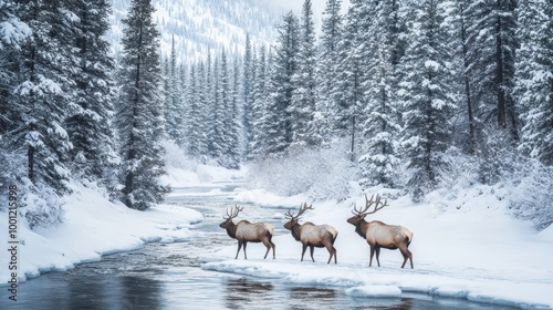 elk, river, winter, snow, forest, wildlife, nature, animal, landscape, cold, crossing, tranquil, serene, river bank, icy, majestic, habitat, fauna, scenery, peaceful, timberland, grazing, herd, environment, frosty, natural, beautiful, wilderness, stunning, character, north, snow-covered, scene, exploration, mountain, cold weather, seasonal, river crossing