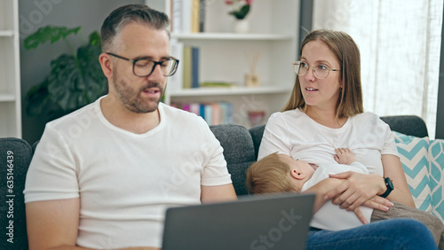 Family of mother, father and baby using laptop sitting on the sofa at home