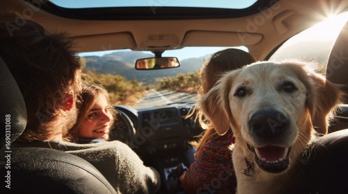 Family Road Trip Adventure: A happy family including a friendly golden retriever embark on a memorable road trip, with sunlight streaming through the car's panoramic sunroof.