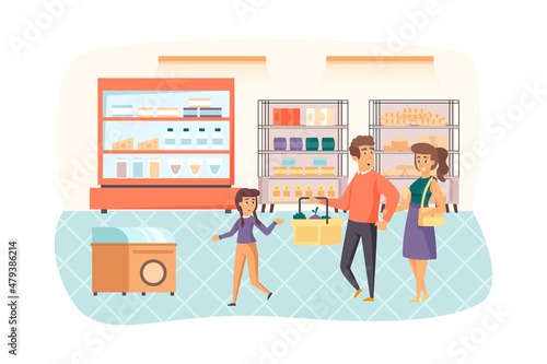 Family shopping at supermarket scene. Father, mother and daughter choosing and buying food at grocery store. Daily routine, retail sale concept. Illustration of people characters in flat design