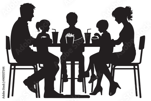 silhouette, family, fast food, table, eating, children, children, mother, father, together, meal, eatery, dinner, lunch, fries, drink, food, joy, love, happy, togetherness, human relationships, design, vector, illustration, graphic, art, black, white, isolated, chair, casual attire, parenting, beverage, fast