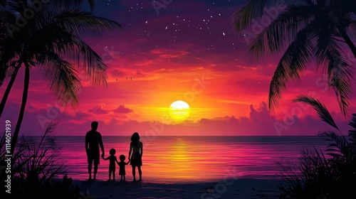 sunset, beach, ocean, family, children, silhouette, palm tree, tropical, vacation, holiday, summer, love, togetherness, happiness, relaxation, peace, serenity, nature, landscape, sky, cloud, dusk, evening, vibrant, colourful, warm, romantic, idylli, paradise, travel, journey, memory, bonding, connection, joy, fun, freedom, escape, hope, life, light, dark, silhouette, scene, view, image, photo, picture