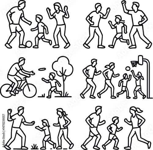 family, sport, icon, silhouette, exercise, leisure, activity, running, cycling, playing, recreation, simple, group, fun, active, fitness, teamwork, motion, movement, health, lifestyle, jogging, eltern, children, illustration, graphic, design, black, white, minimalist, pictogram, symbol, walking, interaction, bonding, togetherness, community, park, game, basketball, tree, path, dynamic