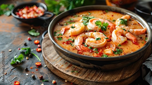 Famous Hot and Spicy Thai Soup "Tom Yum Kung" - coconut shrimp soup with noodles and shiitake mushrooms on wooden table