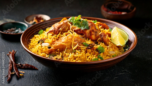 Famous Hydrabadi chicken dum biryani with chicken pieces on the topic served in a plate served with onion raitha closeup with selective focus and blur