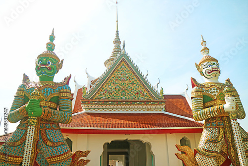buddhist, temple, wat arun, bangkok, siam, asia, entrance, gate, doorway, facades, stature, sculpture, guardian, giant, daemon, massive, mythology, ornate, decorative, church steeple, religious, worship, sacred, holy, culture, architecture, building, old, historic, famous, landmark, sky, sunlight, gorgeous, incredible, beautiful, amazing, view, travel, tour tourism, holiday, vacation, visit, leisure, copy space