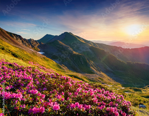 Fantastic Mountain landscape during sunset. Pink rhododendron flowers on under sunlight