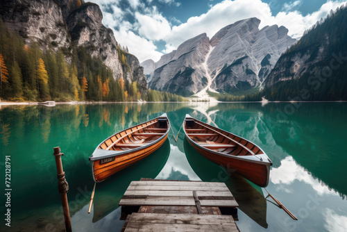 Fantastic view of famous Braies lake in Dolomites, Italy