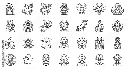fantasy, mythical, creature, icon, unicorn, dragon, ghost, magician, vampire, supernatural, magic, mystical, adventure, imagination, illustration, creative, art, design, folklore, legend, mythology, enchanted, spell, black magic, witchcraft, horror, skittish, eerie, whimsical, decorative, artistic, graphic, symbol, emblem, vector, drawing, vignetting, monochrome, detail, elegance, timeless, classic, aesthetic, branding, storytelling, digital composition