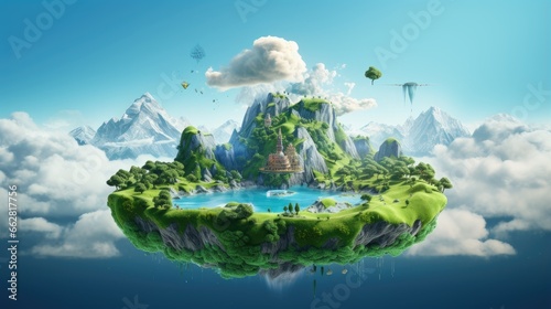 fantasy floating island with mountains, trees, and animals on green grass isolated with clouds. 3d illustration of flying land with beautiful land scape.
