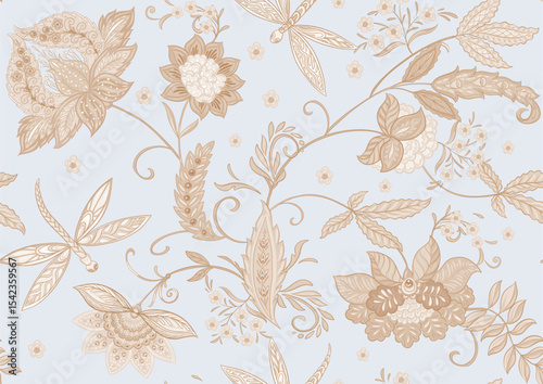 Fantasy flowers and dragonflies in retro, vintage, jacobean embroidery style. Seamless pattern, background. Vector illustration.
