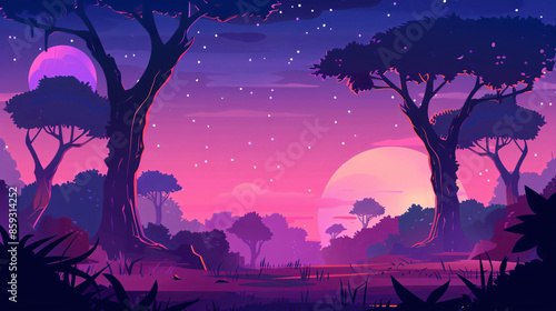 forest, night, tree, sky, star, moon, sunset, silhouette, fantasy, magical, mystic, nature, landscape, background, illustration, digital artwork, colourful, vibrant, purple, pink, blue, graphic, design, vector, artwork, digital, painting, graphic design, banner, wallpaper, card, postcard, poster, print, decoration, cover, abstract, dream, mystical, enchanted, surreal