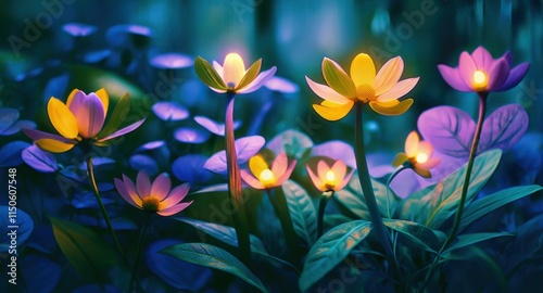 Fantasy glowing flowers, bioluminescent petals, magical forest, ethereal lighting, deep blue background, mystical garden, vibrant colors, dreamlike atmosphere, digital painting, intricate details, sur