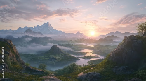 Fantasy landscape sunrise misty valley