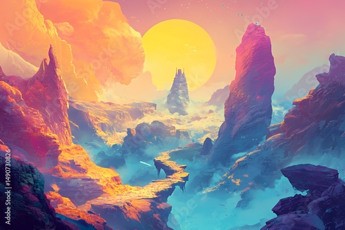 landscape, fantasy, mountain, rock, sky, sun, path, tower, vale, dream, scenery, orange, stone, peak, distant, vibrant, colours, rocky, cloud, art, day, travel, background, nature, artistic, scene, cliff, terrain, environment, adventure, exploration, beautiful, ai, illustration, artwork, daylight, sunset, sunrise, panorama, vista, escape, destination, journey, future, imagination, fairy tale, wonder